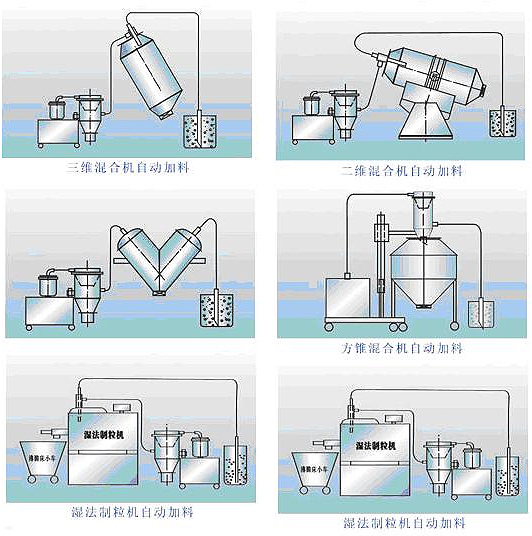 該機是粉狀料、粒狀料、粉粒料混合料的真空輸送設備。真空上料機能自動地將各種物料輸送到包裝機、注塑機、粉碎機等設備的料斗中,也能直接把混合的物料輸送到混合機(如V型混合機、二維混合機、三維混合機等)中,減輕了工人勞動強度,解決了加料時粉塵外溢等問題,是制藥廠、食品廠通過認證、促進清潔、文明生產的設備。
