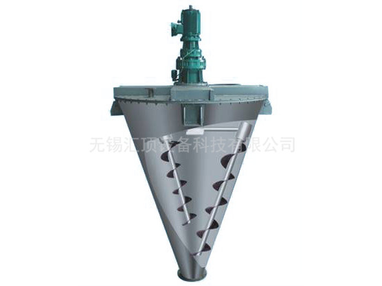 混合機(jī)筒內(nèi)的兩只非對稱螺旋的快速自轉(zhuǎn)將物料向上提升,形成兩股非對稱沿筒壁自下向上的螺柱形物料流,轉(zhuǎn)臂帶動(dòng)的螺旋公轉(zhuǎn)運(yùn)動(dòng),使螺旋外的物料不同程度進(jìn)入螺柱包絡(luò)線內(nèi),一部分物料被錯(cuò)位提升,另一部分物料被拋出螺柱,從而達(dá)到合圓周方位物料的不斷擴(kuò)散,被提到上部的兩股物料再向中心凹穴匯合,形成一股向下的物料流,補(bǔ)兗了底部的空穴,從而形成對流循環(huán)。由于上述運(yùn)動(dòng)的復(fù)合,物料在短時(shí)間內(nèi)獲得了均勻混合,混合精度較高。