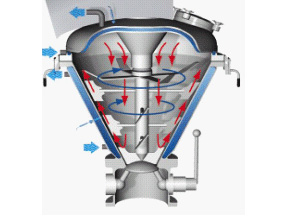 VC混合機(jī)由擺線減速機(jī)連接中心螺桿及外層螺帶以相同轉(zhuǎn)速運(yùn)轉(zhuǎn)。工作時中心螺桿將混合物料由底部提升到頂部,同時線速度較大的外部螺帶將物料由下向上沿錐形桶壁盤提升,兩種運(yùn)動在離心力作用下又將物料沿切線方向拋向空間,物料產(chǎn)生強(qiáng)烈的對流剪切、擴(kuò)散,從而達(dá)到快速混合的目的(中心螺桿也可做成反向螺桿)。
